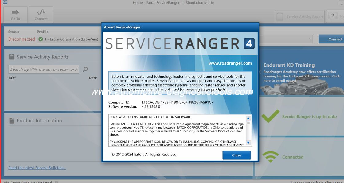 Eaton Service Ranger 4.13 Marka: EATON Aktualizacja: 2025 Wersja: v4.13 Kategoria: Ciężarówki i ciężkie ciężarówki Wielkość pliku: 1,2 GB Rodzaj oprogramowania: DIAGNOSTIC Region: WSZYSTKIE REGIONY System operacyjny: WINDOWS 10/11 (64 BITS) Język bazy danych: angielski Język interfejsu:Angielski, francuski, hiszpański 1.Eaton Service Ranger 4.13 to narzędzie diagnostyczne i serwisowe dla automatycznych przekładni Eaton. 2.Oferuje funkcje takie jak odczytywanie kodów błędów, monitorowanie danych, raportowanie aktywności serwisowej i kalibracja sprzęgła, a także możliwość aktualizacji oprogramowania i zmiany ustawień konfiguracji. 3Najważniejszą nowością w wersji 4.13 jest Kreator połączeń, zaprojektowany w celu uproszczenia procesu połączenia z TECU i TCM pojazdu.